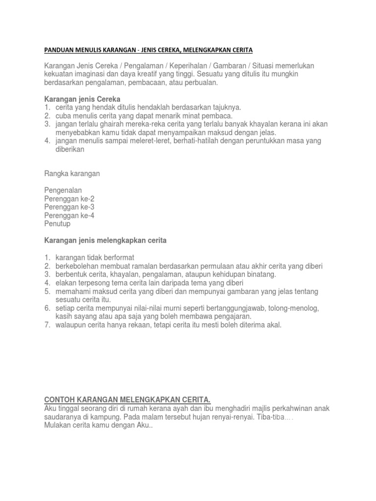 Pengertian Ciri Unsur Struktur Kaidah Jenis. چريتا ريکاءن atau singkatannya cereka disebut cĕréka Jawi. Berikut adalah 10 contoh format karangan Bahasa Melayu PT3 dan SPM yang boleh digunakan sebagai panduan sewaktu mengulangkaji pelajaran dan ketika peperiksaan.